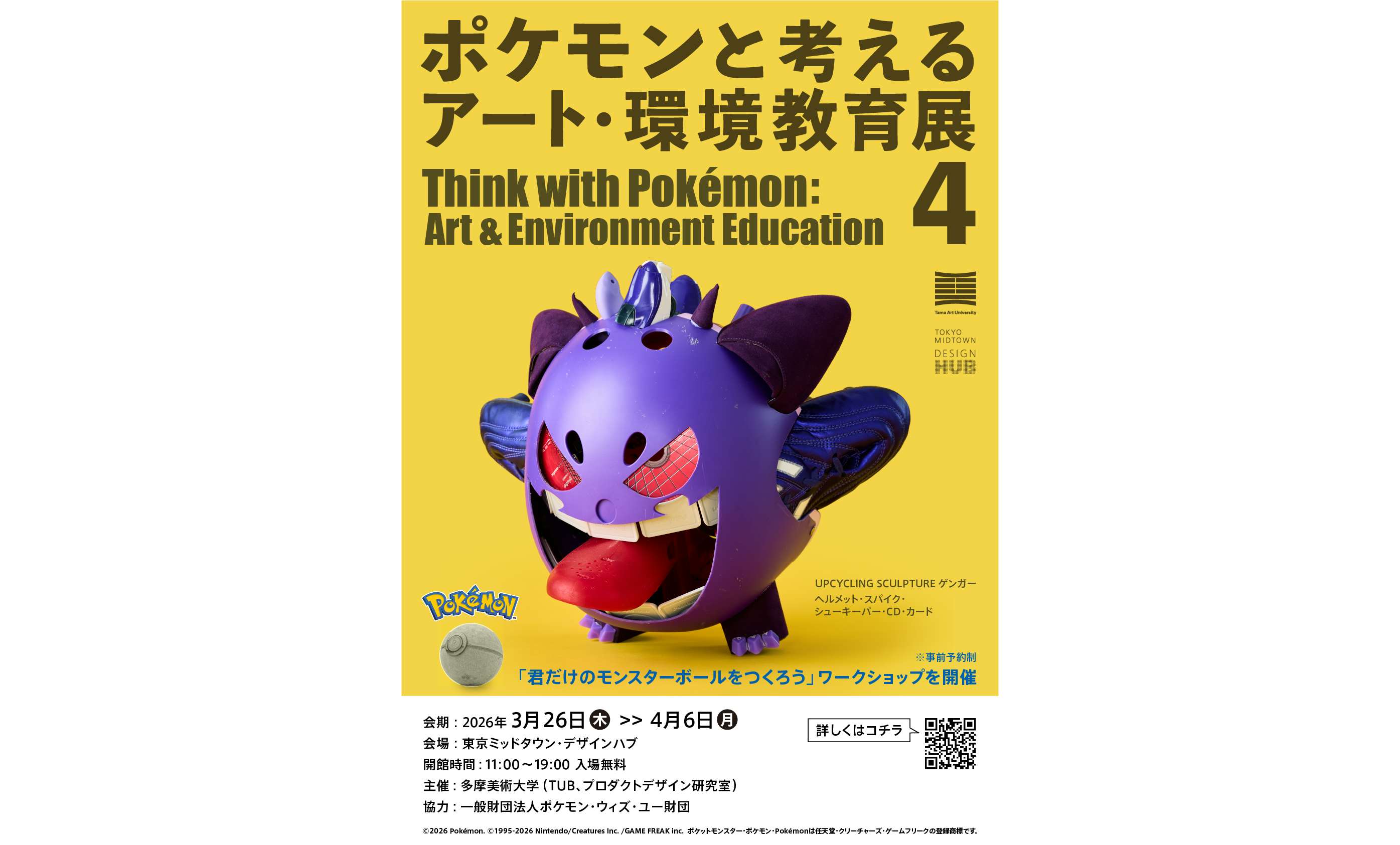 多摩美術大学が、東京ミッドタウン・デザインハブで、不用品や廃材を材料に制作されたポケモンたちの展示を通じ、アート教育が育む感性と環境問題への意識を共に考える試み、企画展「ポケモンと考える アート・環境教育展 4」を開催する。会期は3月26日〜4月6日まで。