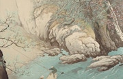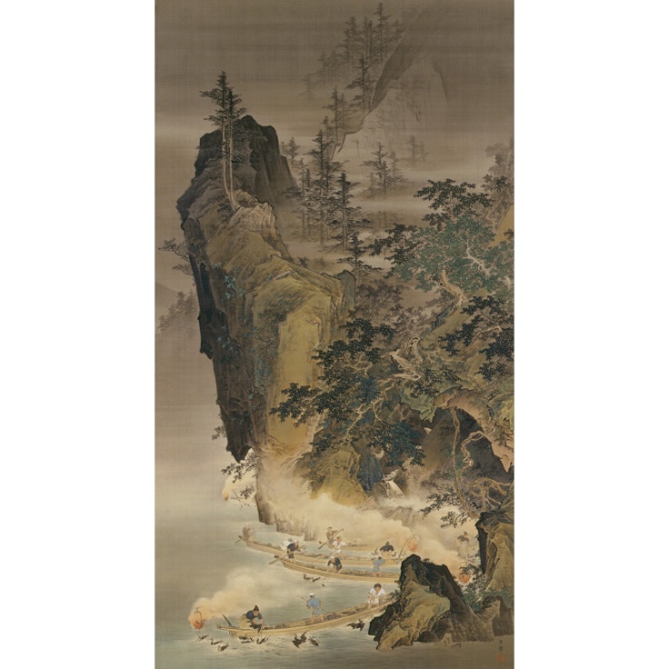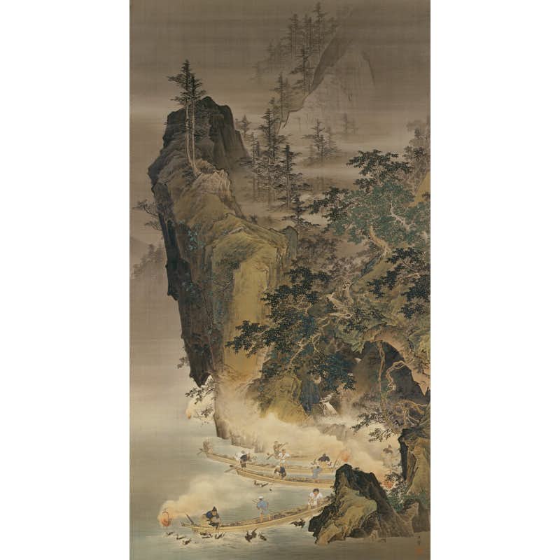 川合玉堂(1873〜1957)は、円山・四条派の基礎のうえに狩野派の様式を取り入れ、伝統的な山水画から近代的な風景画へと新たな境地を拓いた日本画家だ。東京画壇における中心的な役割を果たし、1940年には文化勲章を受章した。日本の山河を愛し、四季の自然や田園風景とそこに暮らす人々を情感豊かに描いたことでも知られている。