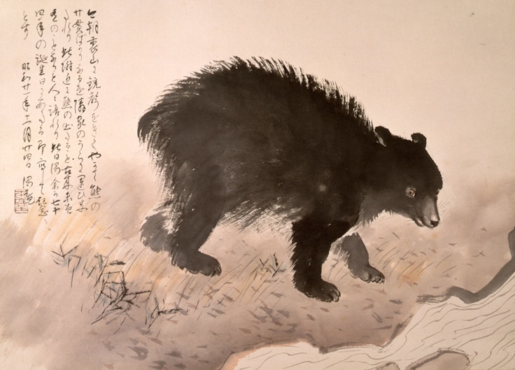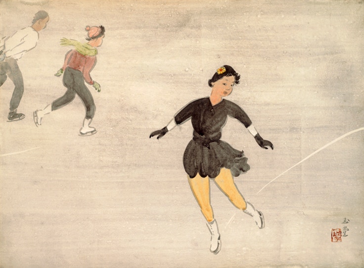 また、交流のあった横山大観、川端龍子との合作《松竹梅》(1955)や、身近な動物を描いた《熊》(1946)、1953年作の《氷上(スケート)》(1953)なども紹介される。