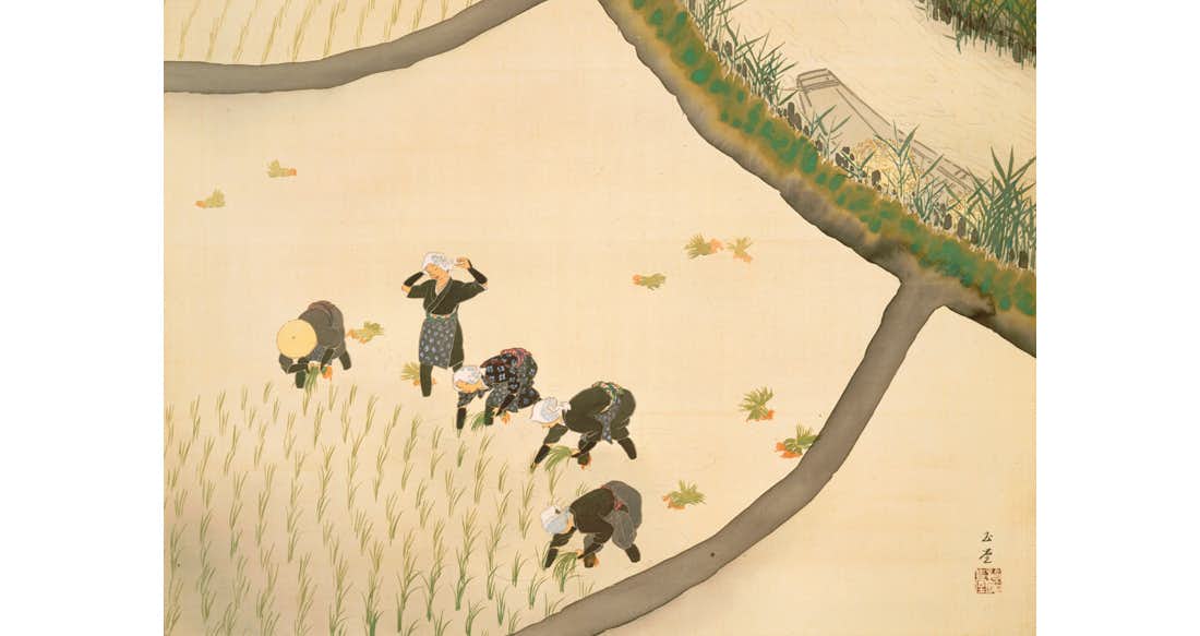 会場では、初期の代表作である《鵜飼》(1895)から、琳派研究を通じて誕生した大正期の《紅白梅》(1919)、古典的な筆法と写実的な風景表現を融合させた昭和初期の《石楠花》(1930)、自然とともに生きる人々の姿を描いた《春風春水》(1940)や《早乙女》(1945)、戦後の第1回日展に出品された《朝晴》(1946)までが展示され、その画業の足跡をたどるものとなる。