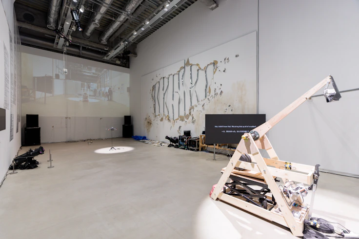 タイトルの「浮遊する器官」とは、外部化された「器官」としてのテクノロジーが、その基礎となる「有機的な身体」から切り離され、再配置され得る状態を指す。同時に、ドローンやAIをはじめとしたテクノロジーは、浮遊した位置から人間の目や手、脳といった器官を代行し、ときには戦争などの暴力へと利用されてきた現実も示している。会場では、BUGの7.2メートルにも及ぶ天井高を存分に活かし、AIを搭載したドローンとそれを撃墜しようとする装置たちが対話を重ねる新作を目の当たりにすることができる。