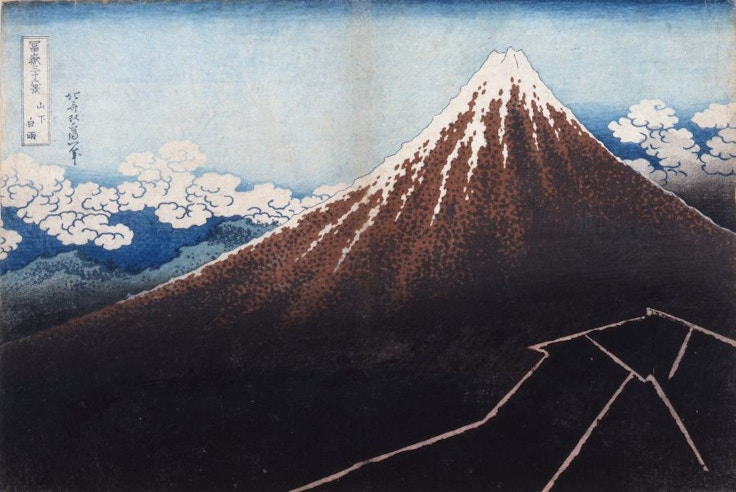 通称「赤富士」と呼ばれる《凱風快晴》は、数ある作品のなかでも指折りの一枚。本展ではこれに加えて、「波の画家北斎」の名を生んだ名作《神奈川沖浪裏》、山麓に稲妻が光る《山下白雨》のいわゆる「三役」をはじめとする、46図すべてを一挙に公開する。