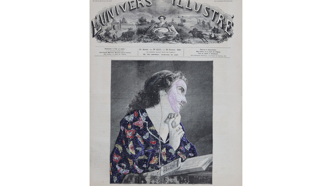 本展では、19世紀ヴィクトリア朝時代のビンテージプリントにドローイングや刺繍を施した新作30点を発表。ファッションやポップ・カルチャーの世界で活躍する現代の女性が当時にタイムスリップしたかのような作品となっている。女性の肖像は、「ジェンダー・スタディーズ」としての一面を持つテキスタイル・アートを学んだ青山にとって重要なテーマの一つだ。