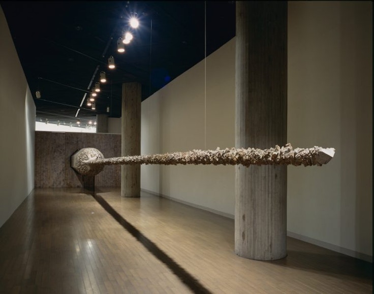 この展覧会では戸谷成雄の彫刻を、このようなせめぎ合いの中にあるものととらえ、「現れる彫刻」をテーマに近年の代表的な大型作品を中心とする約20点を展示。初個展作《POMPEII ‥ 79〈Part1〉》(1974)を起点に、彫刻への根源的な問い、彫刻の発現とその新たな可能性を探る。また、彫刻の構造が概念的に示された大型彫刻では、戸谷の思考の内部に入り込むような体感もできる。