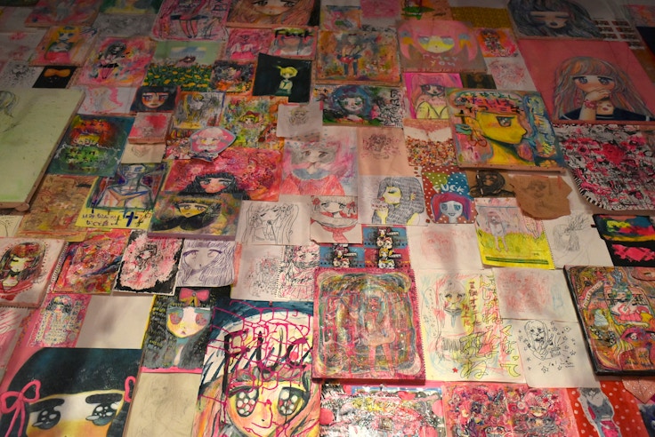 膨大な数のドローイング、ペインティングにはアイコンのように女の子が描かれている。これは「自分の心の中にいる女の子なんです。自分では言えないことを言ってくれている。この子を描くから気持ちが落ち着くんです」。メディウムは多種多様で、油絵具やアクリル絵具からクレヨン、化粧品まで幅広い。さいあくななちゃんの展示は毎回、本展のような展示スタイルをとっており、その理由をこう話す。「毎日絵を描いているから、作品の数が多い。それを展示するためには必然的に場所が必要だからこのスタイルなんです」。
