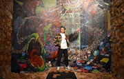本展のためだけに、実家で1年をかけて制作したというこの作品。中心にそびえる巨大絵画には、その自殺現場と慰霊に集まった人々、慰霊の意味を持つ花火、無数の鳥、巨大化したサソリなど様々なモチーフが力強く、しかしこと細かに描かれている。「自殺というものがわからなくて調べていくうちに、Oさんがよく出てきたんです。Oさんの自殺後は後追い自殺が多かった。この自殺を別のものに置き換えたい。芸術の力で変えられるということを証明したかった」と話す。「慰霊の現象が自殺現場を聖地化させてしまう。死者に対して、生きている人間が向き合う方法が興味深いと思って作品化したんです」。