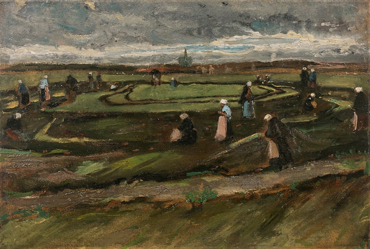 Vincent van Gogh, Raccommodeuses de filets dans les dunes, 1882 Huile sur papier marouflé sur panneau