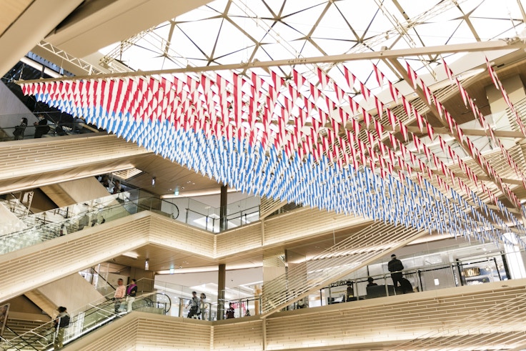 GINZA SIXの新たな顔として巨大インスタレーション《ムクドリの飛行のように—GINZA SIXにて》がお目見えした。同作は、約9メートル×約19メートルという巨大なサイズで、フランス人アーティスト ダニエル・ビュレンによるもの。ビュレンのトレードマークである8.7センチのストライプ模様を旗に用いており、赤と青の計1500枚の旗で構成されている。