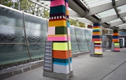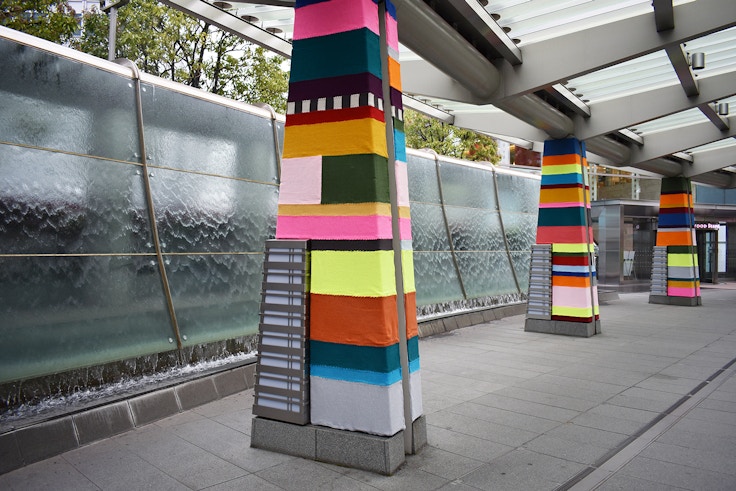 この毛糸によるインスタレーションはテキスタイル・アーティストのマグダ・セイエグの手によるもの。街にある無機質なものに毛糸の編み物をかぶせることで、都市の風景を変容させるというアートプロジェクトを世界30ヶ国で行っているセイエグだが、アジアでの実施は今回が世界初だ。