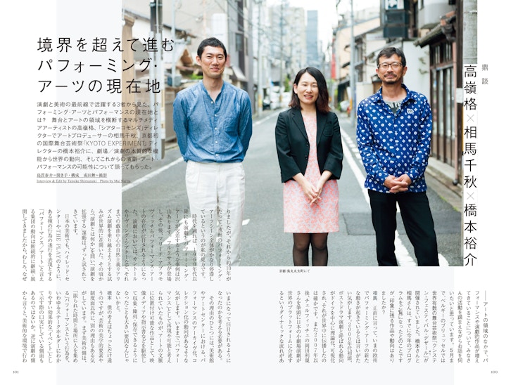 PART3では、演劇とアートの境界を超えて活動するアーティストの高嶺格、「シアターコモンズ」ディレクターの相馬千秋、「KYOTO EXPERIMENT」ディレクターの橋本裕介の鼎談を実施。国内、ヨーロッパ、アジアまで、パフォーミング・アーツのいまを語り尽くす。