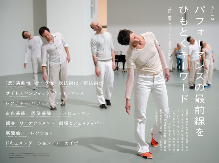 さらに、国際舞台芸術ミーティング(TPAM)のディレクターなどを務めるドラマトゥルクのマックス=フィリップ・アッシェンブレナーはヨーロッパ演劇の傾向を論じるほか、美術史家および美術批評のクレア・ビショップによる、美術館におけるダンスを論じる論文の抄訳(翻訳=大森俊克)を掲載。
