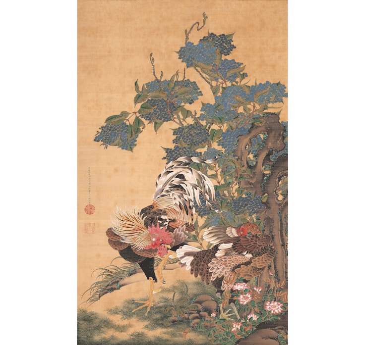 昨年、調査過程で発見されたという若冲《梔子(くちなし)雄鶏図》(18世紀、個人蔵)は、昭和2年まで京都の東本願寺大谷家で所蔵されていたもので、淡泊な色彩や落款の書体などから、若冲30歳代の希少な初期作だと思われるという。