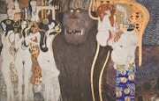 そして本展最大となるのが、全長34メートルにおよぶ《ベートーヴェン・フリーズ》(1984)の複製画だ。ベートーヴェンの交響曲第9番着想を得てクリムトが制作したこの絵画では、光を反射し輝く素材が多用されている。輝きのなかの歓喜を表現した本作の精密な原寸大複製に期待が高まる。