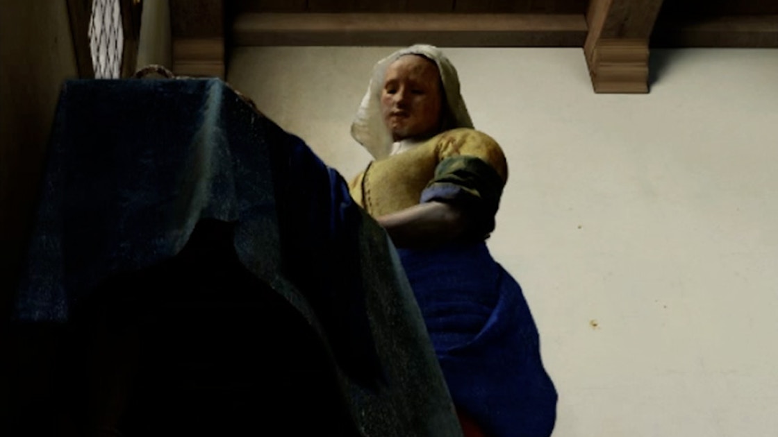 目白大学教授・小林頼子監修のもと、当時の博物資料や研究資料を活用し、作品内の文物の色やかたちを再現。透視図法の読み解きやCGシミュレーションに基づき三次元空間を構築し、鑑賞者はコントローラーでの操作によって、絵画では描かれていない《牛乳を注ぐ女》の背中側や頭上からの視点で作品を鑑賞することができるようになっている。