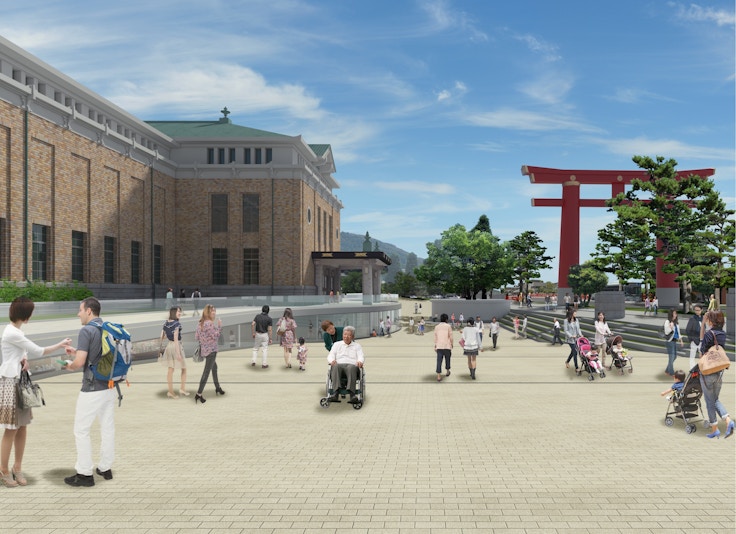 では建物部分を見ていこう。京都国立近代美術館に面しているメインエントランスでは、現在の重厚な外観を維持しながら、新たなエントランスを正面地下に新設。スロープ状の広場から緩やかに入館するアプローチが誕生する。