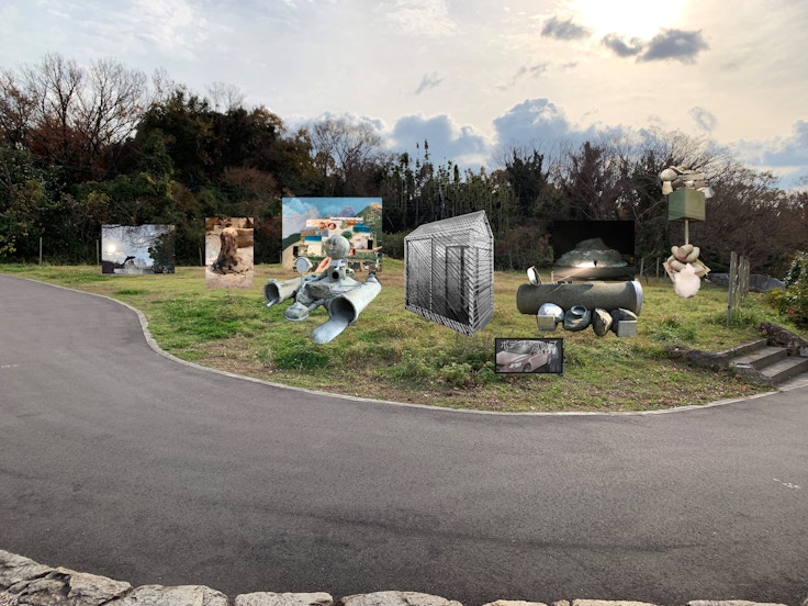 プラスチック製品や雑誌の切り抜き、おもちゃなど身の回りの物を収集し、コラージュ的手法で作品を制作する金氏徹平は、大型看板型の作品写真、屋島から見える採石場の石と建材の破片を使った彫刻、木と水道管を接続した彫刻などによるインスタレーション作品を発表。《S.F(Smoke and Fog)》と題されたこの新作は、屋島や、そこから見える瀬戸内の風景、人為と自然のかたちや空間の関係性などから着想したという。