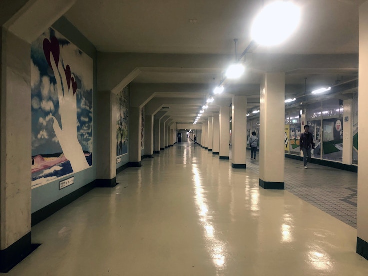 《浴室》が設置されるのは、高速神戸駅と新開地駅を結ぶ地下街「メトロこうべ」。100メートル以上も続く地下通路とシンクロするかのように、いつ終わるとも知れない時空間を体験できる大型インスタレーションだ。公共空間でこのような大規模作品が展開されるのは珍しいと言えるだろう。