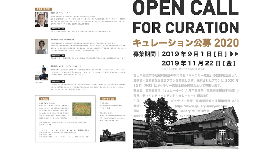 富山県砺波市のギャラリー無量が「キュレーション公募 2020」と題して、古民家を改修した同ギャラリーの空間を活用した意欲的かつ実験的な展覧会プランを1名(1組)募集する。本企画では、国籍や年齢、性別、学芸員などの資格の有無、経験の有無、個人か団体かは問われない。