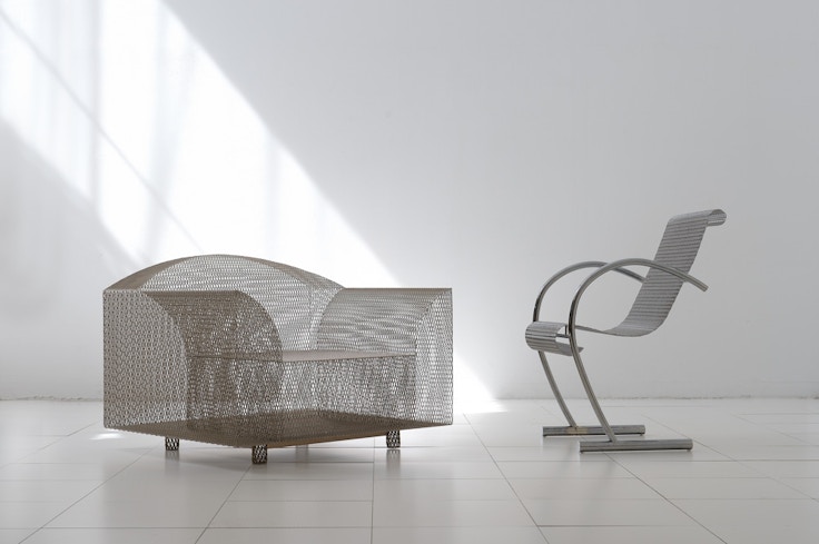 今回復刻される「How High the Moon 」は、建築素材であるエキスパンド・メタルで構成された輪郭がそのまま構造となった、デザイン史においても重要とされる一脚。伝統的なアームチェアのフォルムでありながら、それまで家具に使われることのなかった素材を用いることで、倉俣らしい「軽やかさ」や「儚さ」が表現されている。