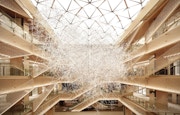 鑑賞する位置や目線の高さによって見え方が変化する《Prismatic Cloud》。吹き抜け空間内の様々な角度から「光の雲」を眺めることで、「感覚を超越した自然のエネルギー」を知覚させるという。