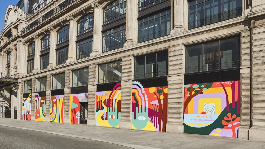 今回、ルイ・ヴィトン本社ファサードに作品を展示したのは、フランス南西部の街オスゴールを拠点として活動するラッキーレフトハンド(スティーブン・バーク)。グラフィックデザインの分野で15年のキャリアを持つラッキーレフトハンドの作品には、人類をもっとも普遍的なかたちで表現したシンボルとして、「ハンド」モチーフがしばしば用いられる。