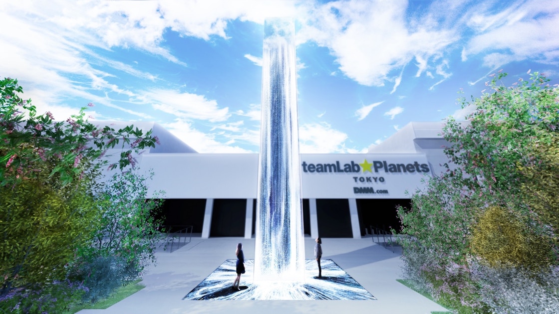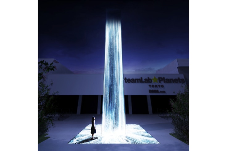 同作は、デジタルテクノロジーを用いたアート作品としては他に類を見ない大きさ。チームラボが考える「超主観空間」によって平面化した滝が描かれ、水の流れは人の振る舞いに影響を受けながら変化し続ける。開放感のある屋外で、入館の有無に関わらず誰でも鑑賞可能となっている。