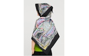 定番のストレッチプリーツをはじめとするプリーツストールやソックスには、《はしるとり》《とぶとり》《ねるふくろう》の3つの新作が登場。《いろいろなはな》《てとはな》《いえとはな》は、作品の伸びやかさを伝えるために⼤判のコットンストールなどに展開したという。生き生きとして迫⼒のある《しましまのとり》《よるのふくろう》は、四⾓形の傘などのレイングッズで表現されている。