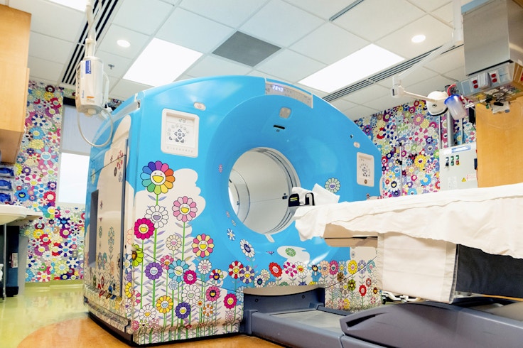 同プロジェクトは、患児の腫瘍の診断に使われるCT/PETスキャナーや検査室の壁に、村上の代表的な「お花」のモチーフを飾るもの。子供たちが治療に関する不安や恐怖を和らげ、病院の空間を明るい色に変えることを目指している。