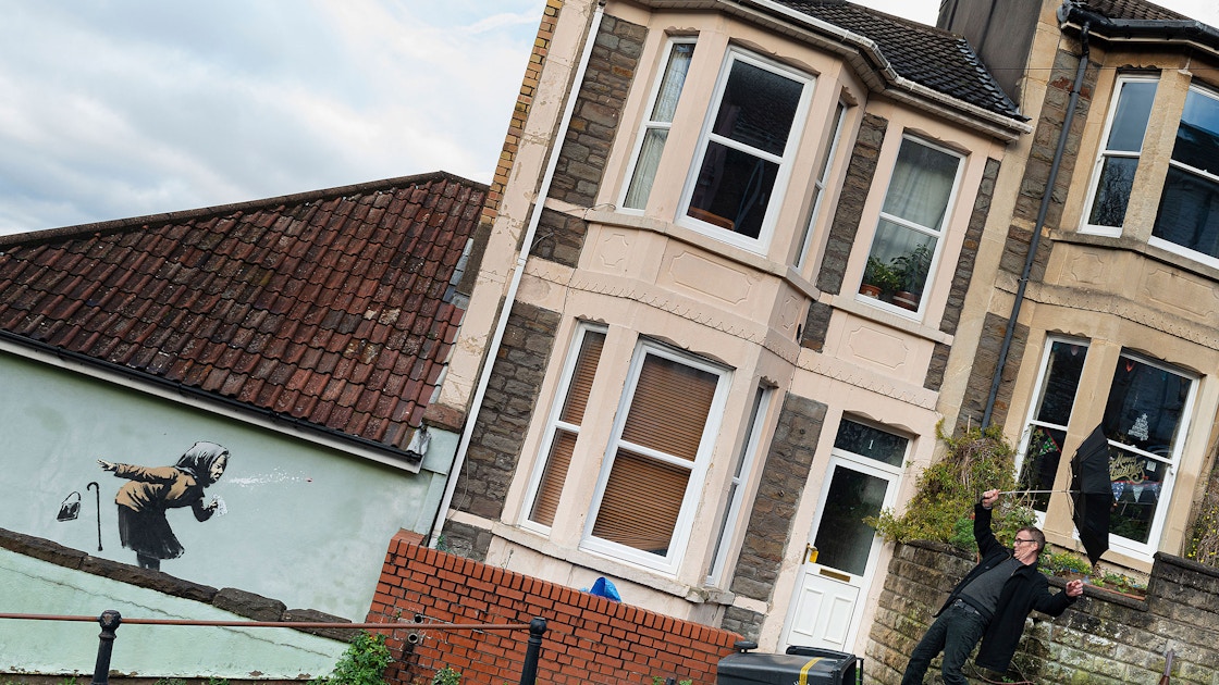 描かれた場所は、バンクシーの地元であるブリストルと推測される。ブリストルは坂の多い街として知られており、この作品の舞台ももともと急坂に沿って家が立ち並んでいる。その傾斜を活かすことで、くしゃみで家が傾いたような演出が可能になったのだ。