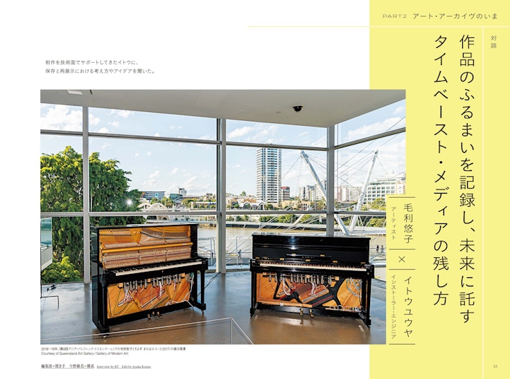 巻頭企画は、現代美術における「アーカイヴ」の基本を解説するQ&Aコーナーと、インターメディアテク館長の西野嘉章、アーカイヴを専門とする研究者の上崎千、修復家の田口かおりが登場する座談会。資料収集からデータベース構築まで多様な「アーカイヴ」のとらえ方、それぞれの実践や今後の課題が議論され、このテーマの概要や幅広さがわかる。