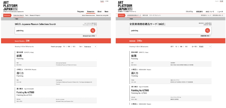 ひとつめが全国美術館収蔵品サーチ「SHŪZŌ」。これは、⽇本全国の美術館に収蔵されている作品情報の可視化と、その国際共有化を⽬指し、全国の美術館や博物館の協⼒を得て収集した美術館収蔵品データを集約したデータベースだ。3月15日時点では全国85館、約7万件の収蔵品情報および1243件の作家情報を公開している。今後、2022年度末までに200館以上、約10万件の公開を⽬指し情報を拡充する予定だ。