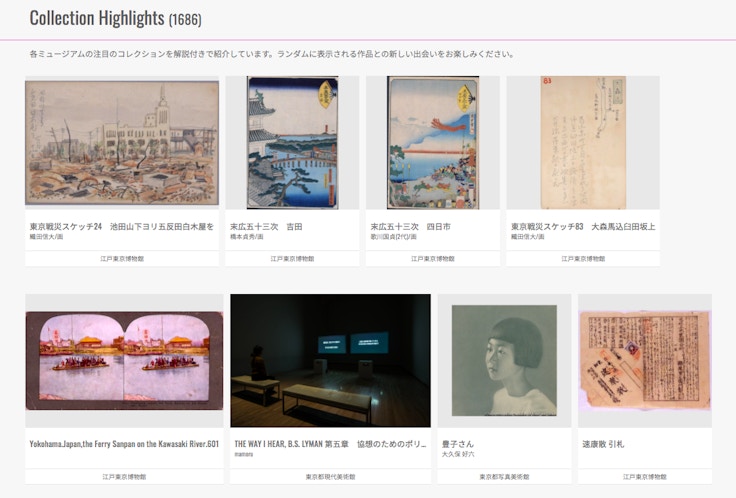 検索対象となる資料・作品は計40万点以上。江戸時代の人々の暮らしを知ることができる民俗資料から現代美術作品まで、東京都の複数の文化施設をネットワークによって横断し、多種多様な資料を検索可能。また、各ミュージアムの注目のコレクションを詳しい解説付で紹介する「Collection Highlights」や、「花見」のように注目のテーマでの横断検索結果を紹介するコンテンツなどもある。