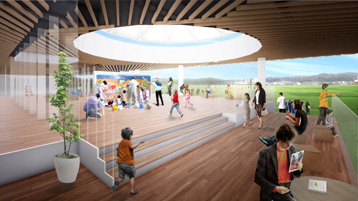また館内1階には全フロアを縦に貫く巨大な空間「ひろま」があり、美術ラーニングセンターとして機能。「ひろま」周辺にはワークショップルームやキッズルーム、ショップ・レストランなどを配置することで、地域に根差したコミュニティと文化を創造・発信する拠点となることを狙う。さらにこの「ひろま」の外側に「えんがわ」と称した空間を設けることで、外に広がる大御堂廃寺跡とのシームレスなつながりを実現する。