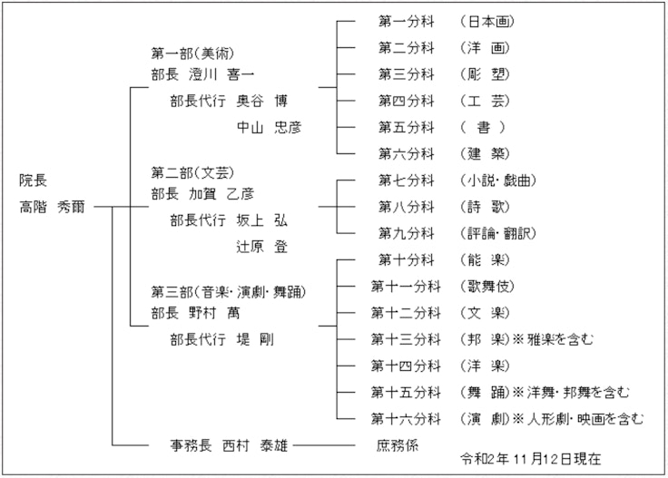 日本芸術院は院長1名と終身の会員120名以内(2021年5月12日の時点では100名が会員)で構成されており、会員の任命は部会の推薦と総会の承認を経て行われる。扱いとしては終身の非常勤国家公務員で、年額250万円の年金も支給される。日本芸術院関連の令和3年度政府予算額は5億2700万円におよんでおり、決して小さい数字ではない。