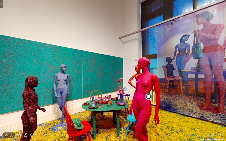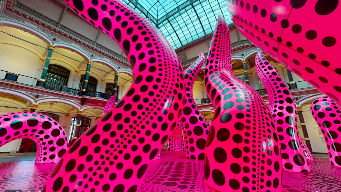 本展では、草間の代表作や直近の絵画作品はもちろん、最初につくられたミラールーム《Infinity Mirror Room Phalli's Field》(1965)を再現した作品や、本展のためにつくられたミラールームの新作《Infinity Mirror Room》(2021)、そして同館の歴史的なアトリウムに出現した巨大な没入型のインスタレーション新作《A Bouquet of Love I Saw in the Universe》(2021)など、約300点の作品を展示。鑑賞者は上述の3Dバーチャル・ウォークスルーを通じ、すべての作品をオンラインで体験することができる。