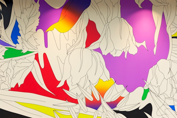 まず入って正面に見えるのが、幅30メートルにおよぶ巨大な壁画《A Daunting Task》。「終わりのない手仕事」を意味する同作について、松山はステートメントの中で「移ろいゆく世の中にありながら、それでもひとつの場所に根を張り、挑み続ける人間の強さと素直さを表現している」と語っている。「背景には鮮やかな色が施されているが、それとは対照的に主役である花には彩色が施されていない。無彩色の花は、持続やプロセスのなかで自己発見や自己成⻑を遂げる我々自身の存在に問いかける意図を込めている」。