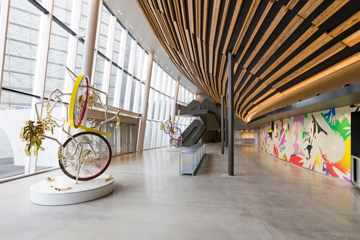 千葉競輪場跡地に建築された新しい競技施設「千葉JPFドーム」。そのメインエントランス側のホワイエスペースに、松山智一の作品が常設展示される。