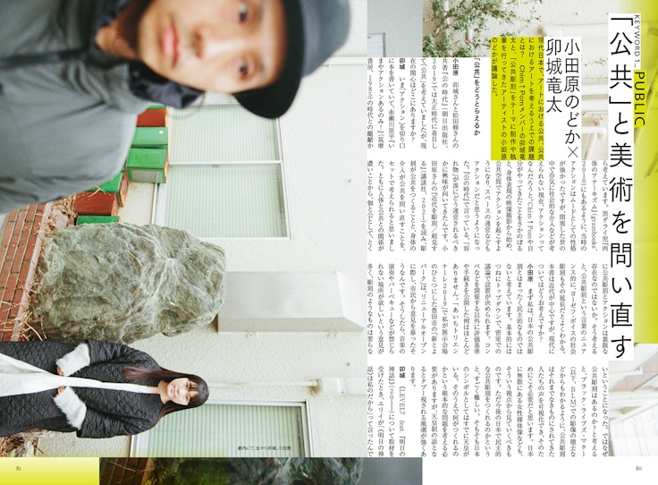 パート2では、個々での活動も展開するメンバーの関心事に着目。小田原のどかと卯城の対談では、美術と「公」の関係について、社会学者・上野千鶴子とエリイとの対談では、アーティストとしてのエリイの内面に迫っている。さらにオルタナティブ・スペースも運営するメンバーの卯城、水野、そして久保寛子、涌井智仁、髙木遊が参加する座談会では、キュレーションの現在的な課題について語り尽くされた。