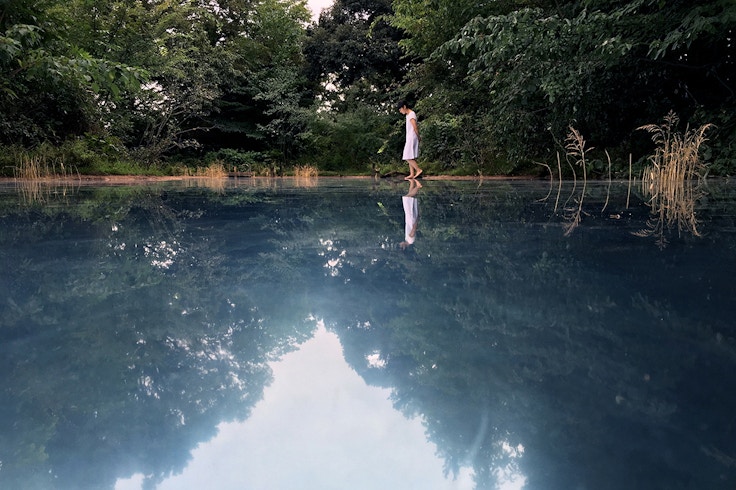 目 [mé]はアーティストの荒神明香、ディレクターの南川憲二、インストーラーの増井宏文を中心とする現代アートチーム。さいたまトリエンナーレ2016では旧埼玉県立民俗文化センターの屋外を会場に《Elemental Detection》を発表。池を囲む森のような風景を出現させた。