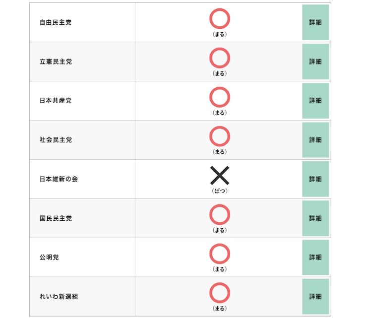 この質問への回答は以下の通りとなり、日本維新の会以外のすべての党が○と答えている。