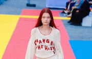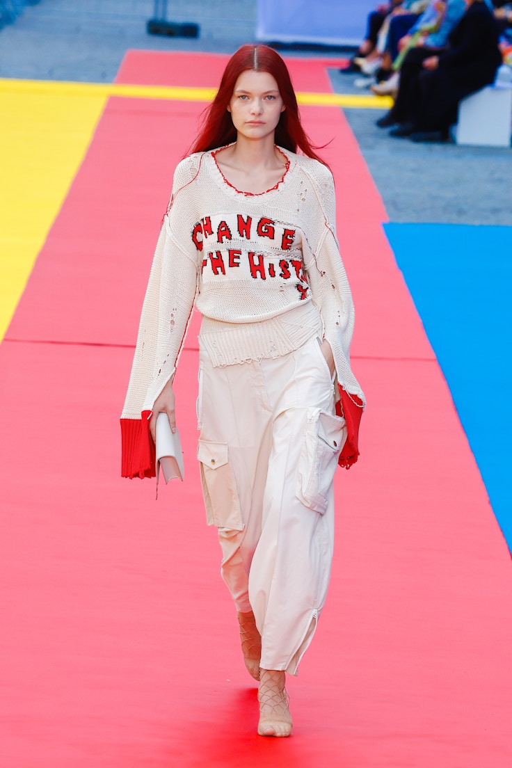 そして今回、ポンピドゥーセンター前に位置するジョルジュポンピドゥー広場で発表されたステラ マッカートニー2023年サマーコレクションでは、奈良が掲げる「CHANGE THE HISTORY」というメッセージからインスパイアされたアイテムが登場した。