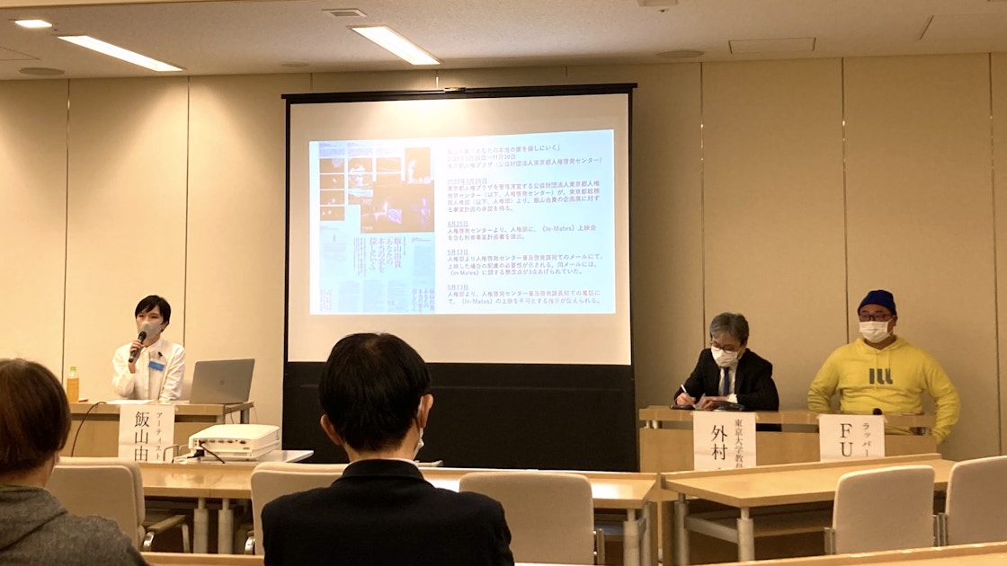 まず、飯山から本問題に係る経緯が説明された。この問題は東京都の指定管理施設である「東京都人権プラザ(公益財団法人東京都人権啓発センター、以下人権啓発センター)」の主催事業として開催されている、飯山の企画展「あなたの本当の家を探しにいく」(~11月30日)の附帯事業に関するもの。本来、この事業として飯山の映像作品《In-Mates》(2021)の上映が予定されていた。しかし、5月12日に人権部から人権啓発センター普及啓発課宛てのメールで上映した場合の配慮の必要性が示され、翌13日、同センターへのメールで上映を不可とする指示が伝えられた。