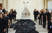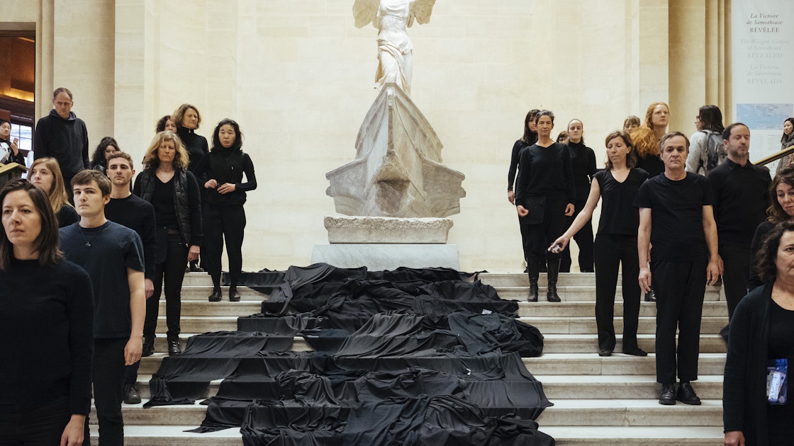 「Liberate the Louvre」は今年1月に立ち上げられたもので、今回が初めてルーヴル美術館内で行われたパフォーマンスとなった。抗議の舞台となったのは、同館を代表する彫刻作品である《サモトラケのニケ》の前。40名からなるメンバーが、それぞれ着用していた黒いスカーフやジャケットなどを脱ぎ、《サモトラケのニケ》からオイルが流れ出ているような演出を行った。その間わずか3分間の出来事だったという。