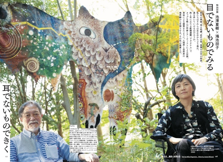 特別企画の池澤夏樹との対談「目でないものでみる 耳でないものできく」では、約1年にわたる新聞連載「ワカタケル」でタッグを組んだ2人の対談が実現。「既存の美術、見る呪縛、近代文明、言葉や文字の拘束から、われわれはどう逃れ、道を歩いていけるのだろうか」をテーマに、身体の感覚を頼りながら、人間界と自然界の境界線から手探りする試みと、その先の風景について会話を交わしている。