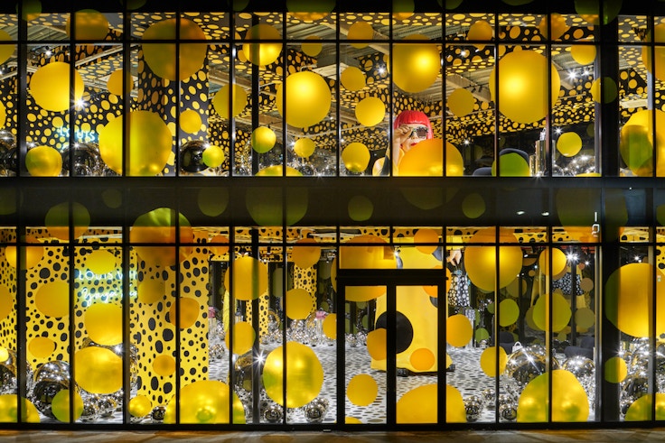 今回のコラボレーションを象徴するような、ドットで覆い尽くされたポップアップストア。外観だけでもそのインパクトは大きいが、内部には草間の代表作《ナルシスの庭》を思わせるようなミラーボールが無数に配置されており、ドットと相まって、無限に広がるような空間を見せている。