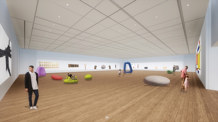 特徴的なのは、館内の全フロアを縦に貫く巨大な空間「ひろま」。展示やワークショップ、コンサートなど多様な用途が見込まれるこの場所を中心に、展示室やテラスなどへの導線が生み出される、まさに美術館のコア部分だ。