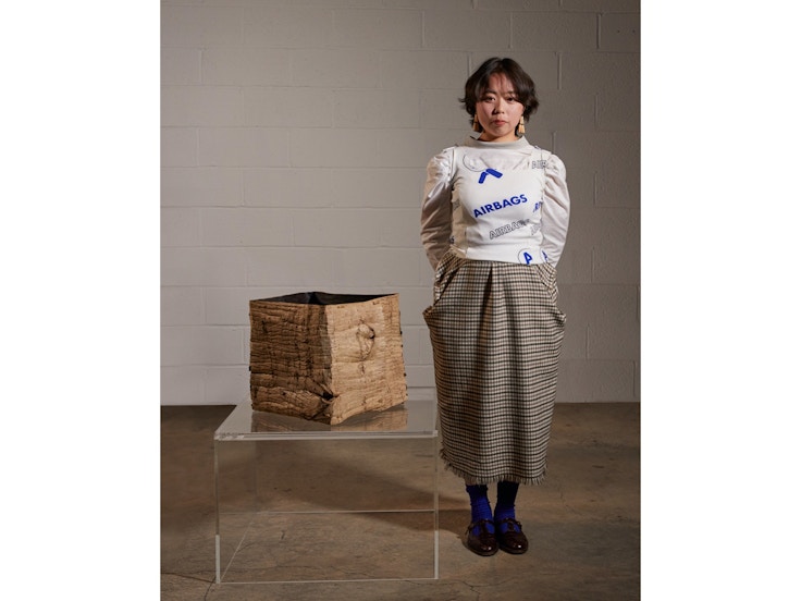 いっぽう、渡部の《Transfer Surface》(2022)は胡桃の木の皮でできた箱からなるもので、季節の循環に敬意を表し、日本古来の伝統である生け花を想起させる。審査員は、樹皮の素材感の素晴らしさと、建築の構造や修理の伝統に着想を得たリベットの使用により、同作の受賞を決定した。