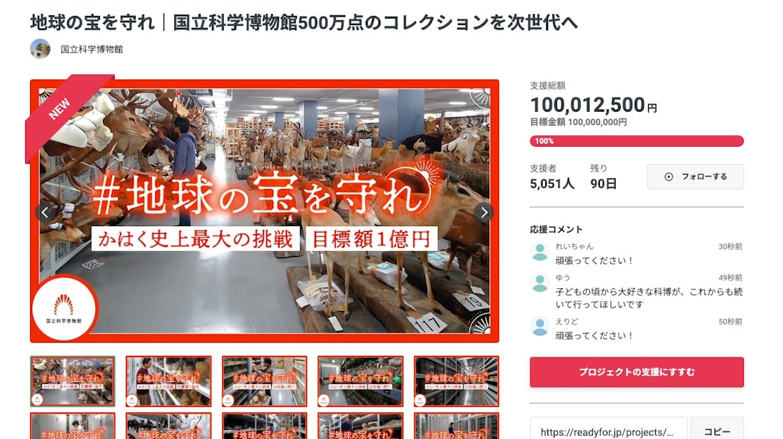 東京・上野の国立科学博物館が、標本資料の収集保管活動の継続を目指して実施したクラウドファンディング「地球の宝を守れ|国立科学博物館500万点のコレクションを次世代へ」が、目標金額の1億円を開始9時間20分後の17時20分に達成した。