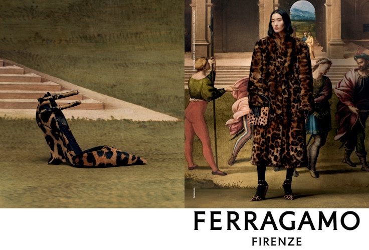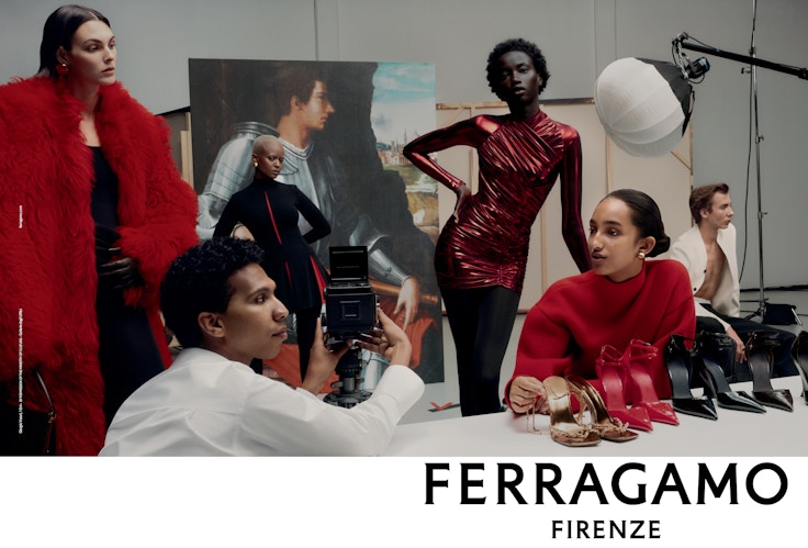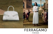 今回、クリエイティブ・ディレクターのマクシミリアン・デイヴィスがブランドの新しいビジョンを描くにあたり、フェラガモはウフィツィ美術館とのパートナーシップを締結。ベッリーニ、ヴェロネーゼ、ボッティチェリの作品のなかに、シャープなテーラリングや精巧なスーツ、豊かな質感のファブリック、大胆な素材や色使い、「ハグ」バッグ、アーカイヴにインスパイアされたゴールドのサンダルなどをまとった、ブランドのミューズやマクシミリアンの友人といった多様なクリエイティブ・コミュニティのメンバーを登場させた。