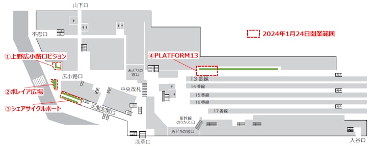 JR東日本は「Beyond Stations構想」として、駅を交通の拠点という役割を超えた「つながる暮らしのプラットフォーム」へと転換を図っている。そのモデル駅である東京の上野駅で、「上野広小路口ビジョン」「ポレイア広場」「シェアサイクルポート」および「PLATFORM13」の一部が、1月24日に開業する。